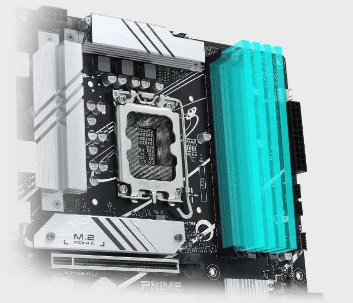 تم تصميم اللوحة الأم برايم B760 خصيصًا لوحدات المعالجة المركزية انتل الجيل الثالث عشر والثاني عشر وتوفر اتصال منفذ الملحقات الإضافية السريع 4.0 لأحدث وحدات معالجة الرسومات الجرافيكية.